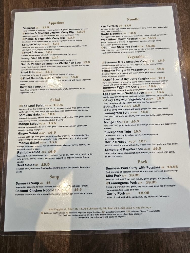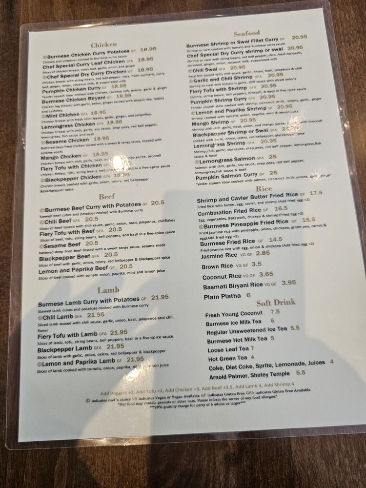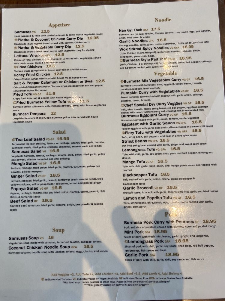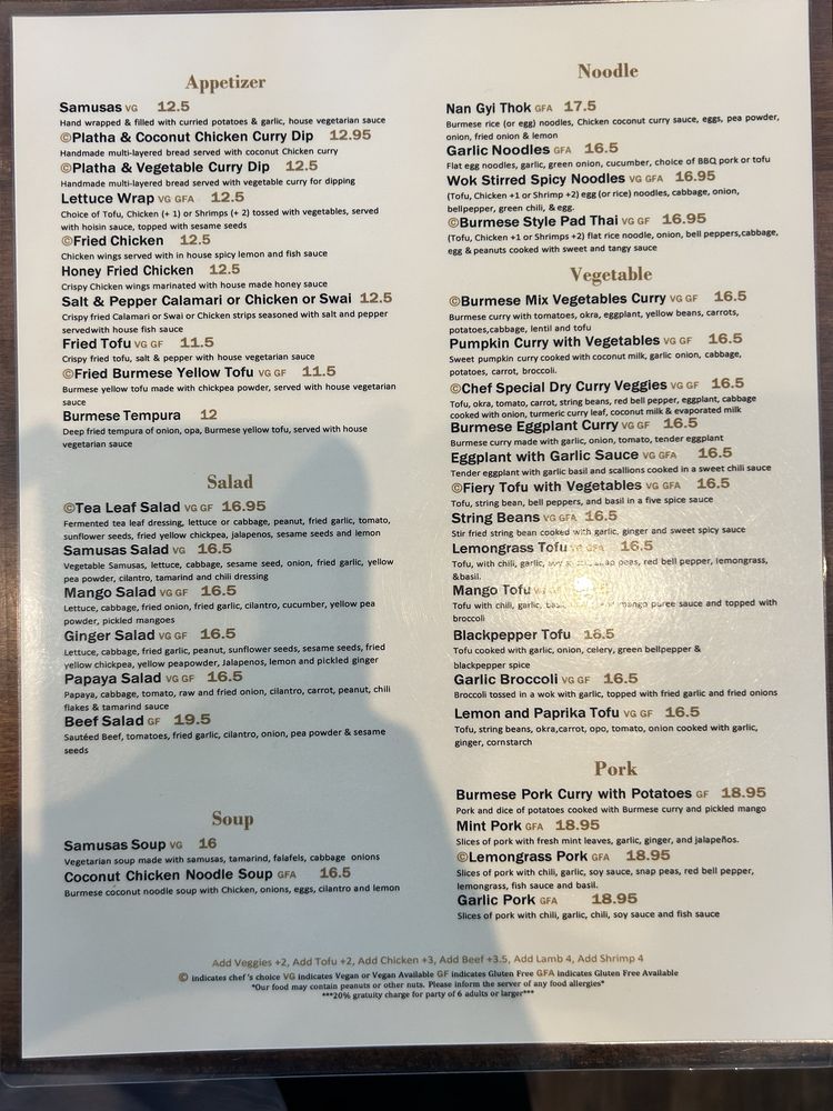 Introducing the menu at My Burma, a trendy and intimate Burmese restaurant in Davis, CA. This women-owned establishment offers a wide array of vegan and vegetarian options, with dishes like Honey Fried Chicken, Nan Gyi Thok, and Tea Leaf Salad receiving rave reviews from customers. The samusas, made with egg roll skins, are a standout appetizer, while the Platha & Coconut Chicken Curry Dip is a must-try starter. The menu also features flavorful Burmese curries, garlic noodles, and fried rice. With options for outdoor seating, catering, and delivery, My Burma provides a welcoming atmosphere for all diners. Don't miss out on this gem for flavorful Burmese cuisine.