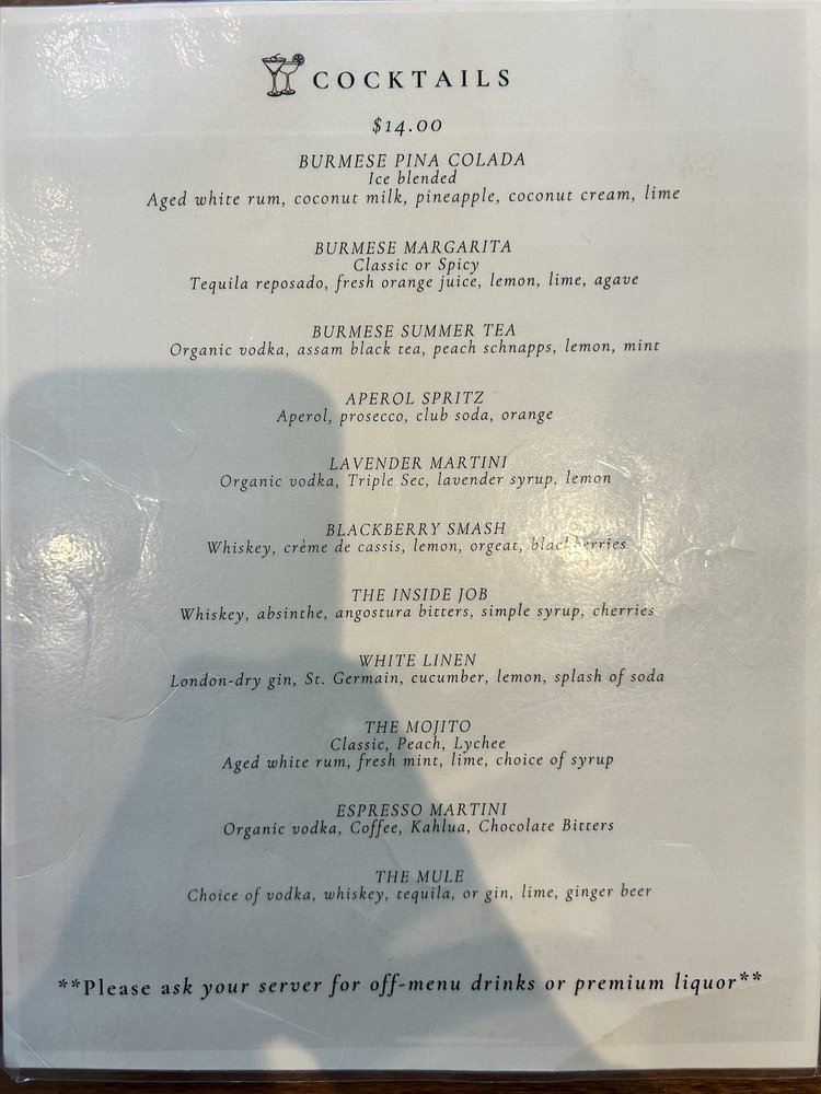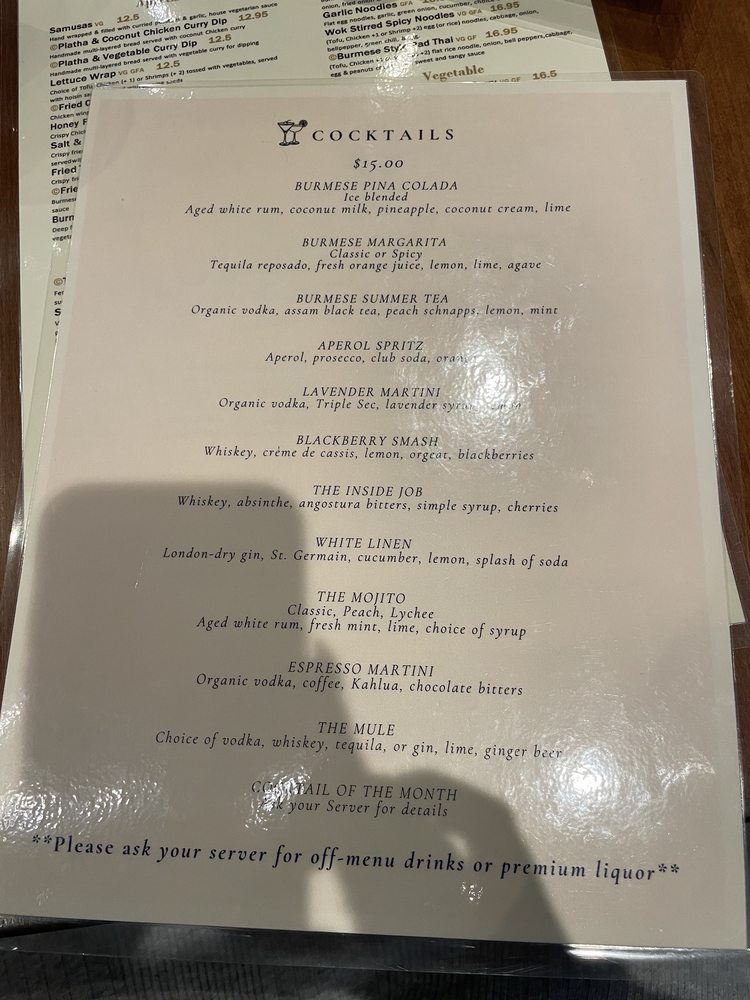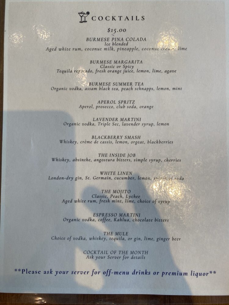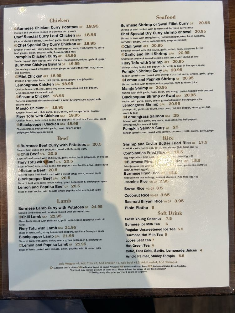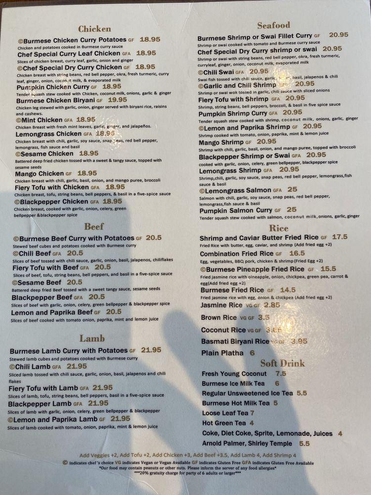 Introducing the menu at My Burma, a trendy and intimate Burmese restaurant in Davis, CA. This women-owned establishment offers a wide array of vegan and vegetarian options, with dishes like Honey Fried Chicken, Nan Gyi Thok, and Tea Leaf Salad receiving rave reviews from customers. The samusas, made with egg roll skins, are a standout appetizer, while the Platha & Coconut Chicken Curry Dip is a must-try starter. The menu also features flavorful Burmese curries, garlic noodles, and fried rice. With options for outdoor seating, catering, and delivery, My Burma provides a welcoming atmosphere for all diners. Don't miss out on this gem for flavorful Burmese cuisine.